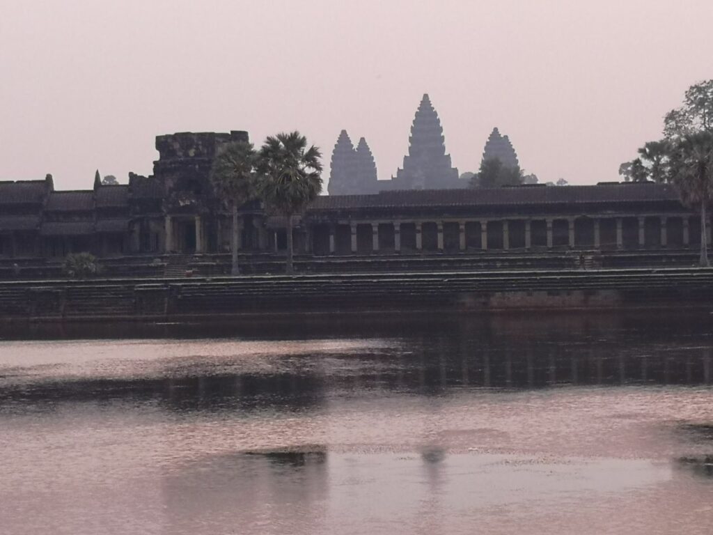 Für den nächsten Tag habe ich einen Tuktukfahrer gebucht, der mich auf die große Runde bringt, das heißt zu den Tempel, die etwas weiter außerhalb liegen. Das startet bereits um fünf Uhr an der Unterkunft. Zunächst ist unser Tuk-Tuk Teil einer größeren Karawane, die in die Dunkelheit führt. Die letzten Meter führen mich zu Fuß teilweise im Stockdunkeln zusammen mit vielen anderen Touristen in der Nähe von Angkor Wat. Jetzt um kurz nach halb sechs kann man nur mit google maps oder Ähnlichem feststellen, dass man gleich auf Anchkor Wat blicken wird. Nach und nach wird es heller und nach und nach nimmt der Gebäudekomplex Gestalt an.