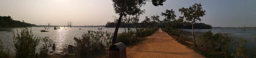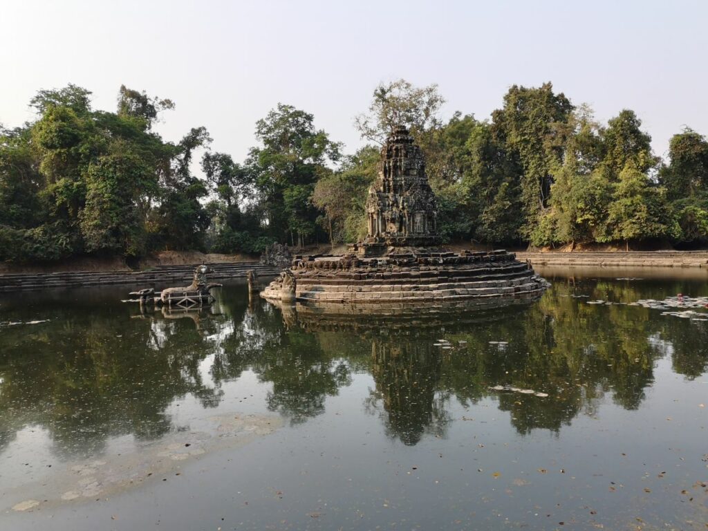 Dann schaue ich mir den Neak Pean Tempel an. Der ist klein und liegt inmitten eines riesigen Teiches. Allein der Weg über den Deich an diesem Morgen ist es wert hier zu sein.