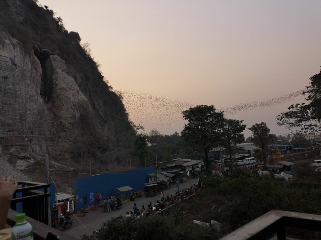 Klöster oder Pagoden habe ich schon viele gesehen. Der eigentliche Grund, hier heraus zu fahren, sind Fledermäuse. Die Leben zu Millionen in einer für Menschen unzugänglichen Höhle, aus der sie gut herausfliegen können. Pünktlich mit einsetzender Dämmerung schwärmen die Flieger aus. Das dauert insgesamt etwa 40 Minuten. Der Schwarm ist in den ersten 15 Minuten so stark wie auf diesem Bild und wird erst nachher schwächer. Was für ein Extrem der Natur!