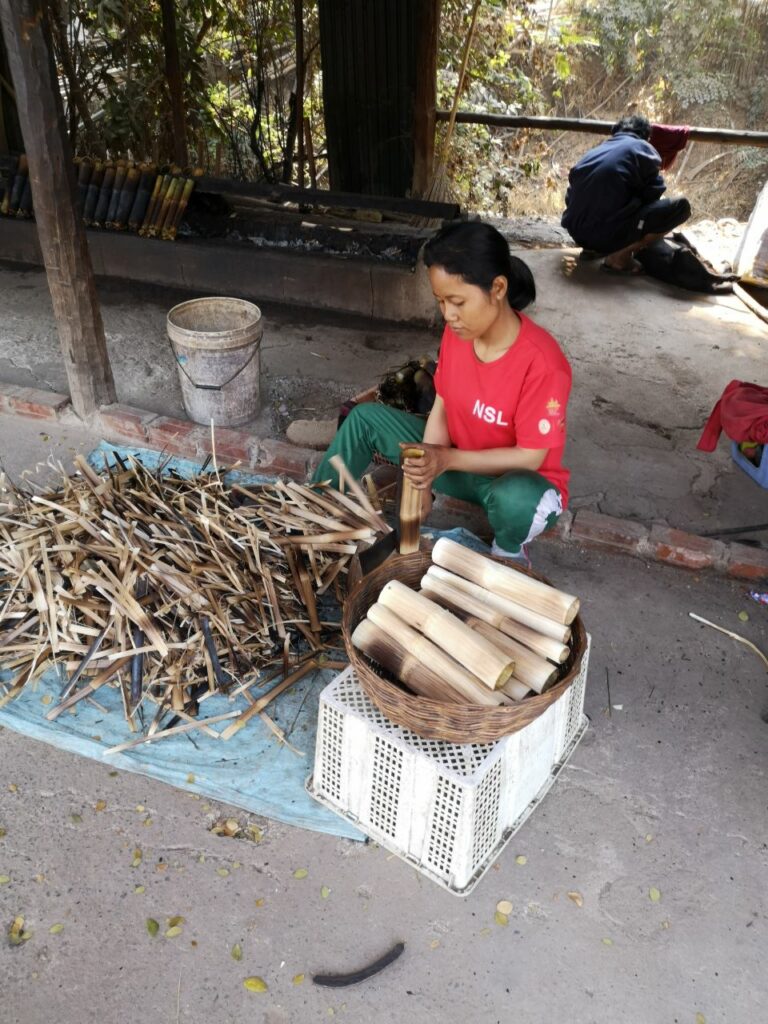 Für den Bambusreis wird der Reis zunächst in dem Bambusrohr gegart und danach der äußere Rand des Bambusrohres fein abgeschlagen. So ist das eine Delikatesse, sagte man mir.